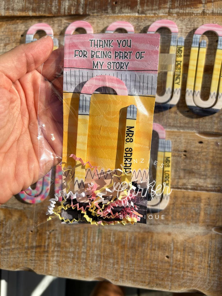 This is for a COMPLETED paper clip shape bookmark with the pencil design and paper backing and clear bag.